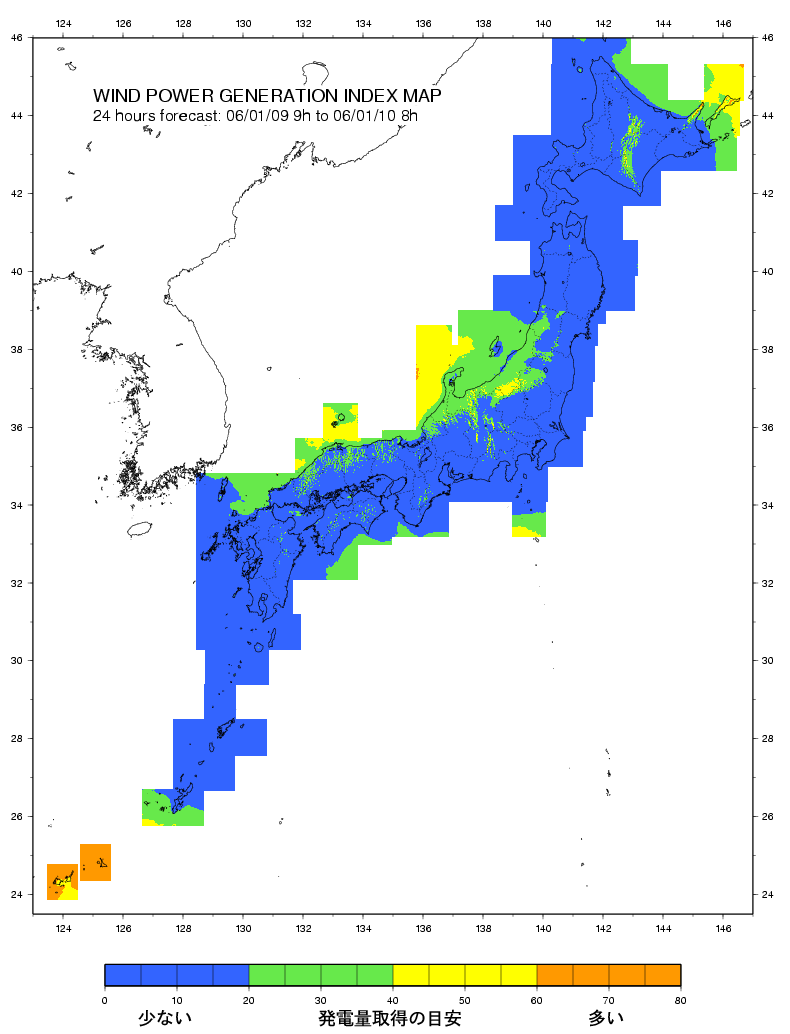 風速の予測値はLAWEPS-1次領域モデル(10kmメッシュ)をもとに